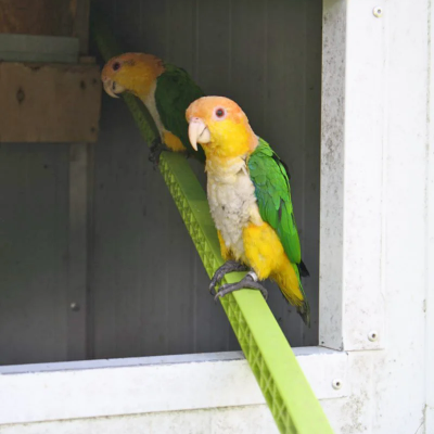Les Caïques à cuisses jaunes (Pionites leucogaster xanthomeria)Les Caïques à cuisses vertes (Pionites leucogaster leucogaster)