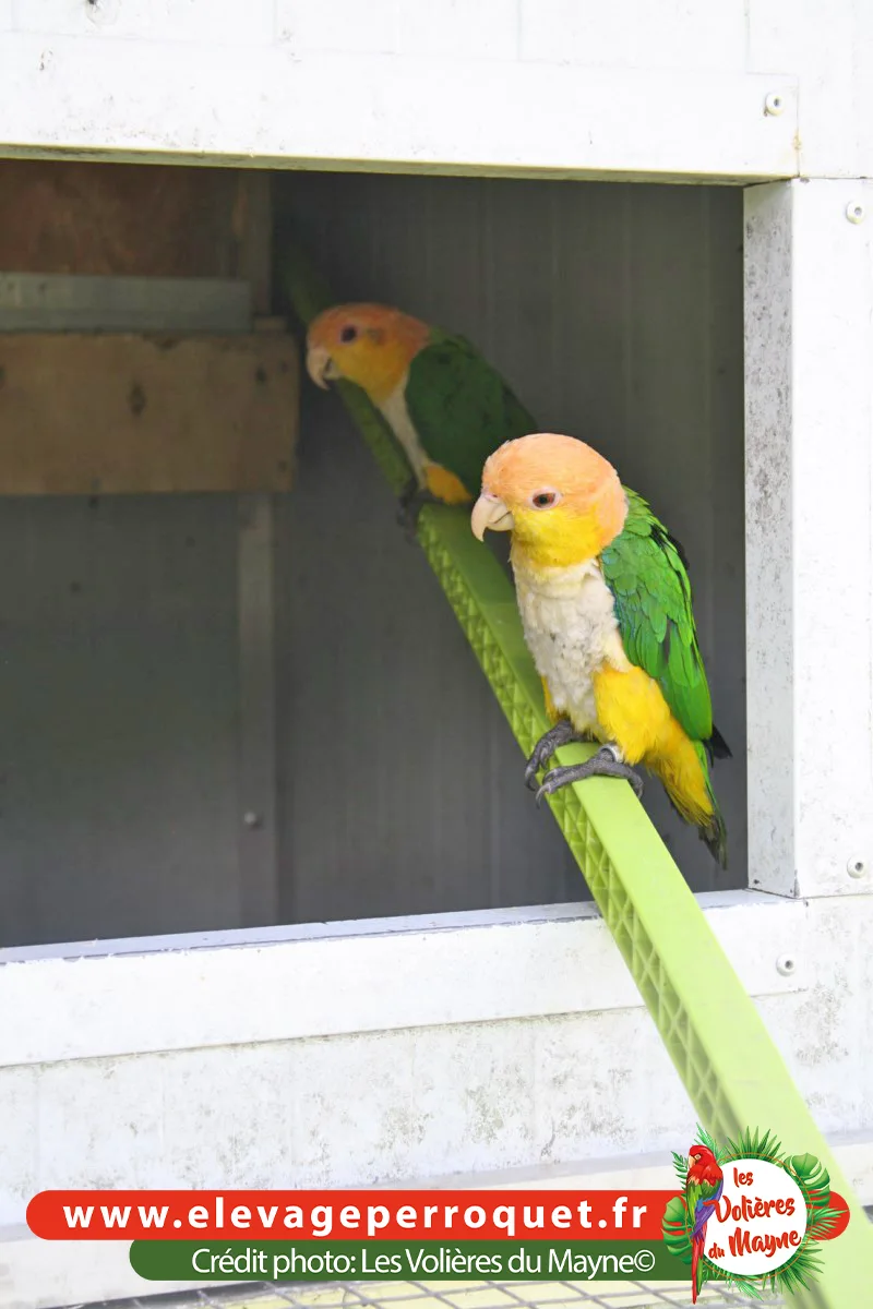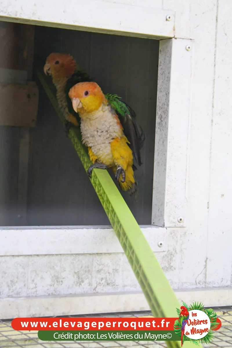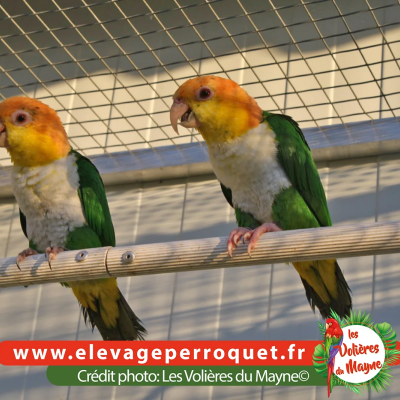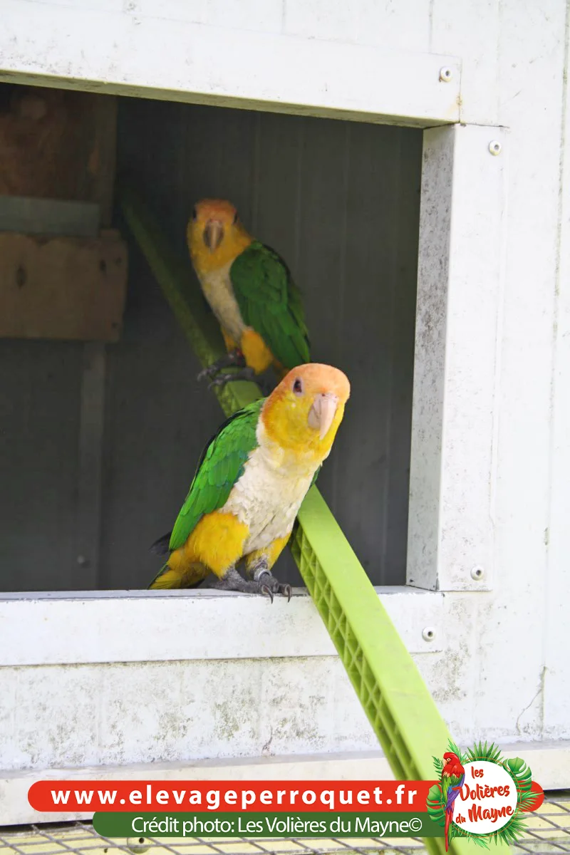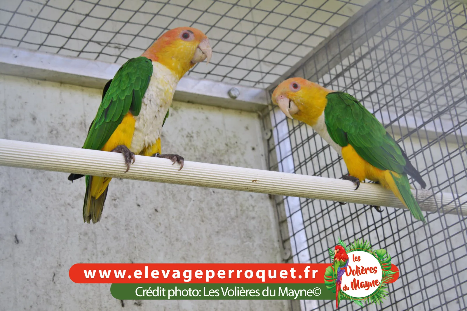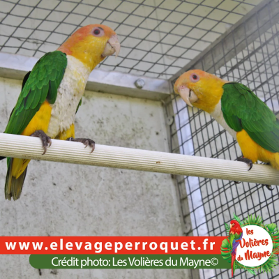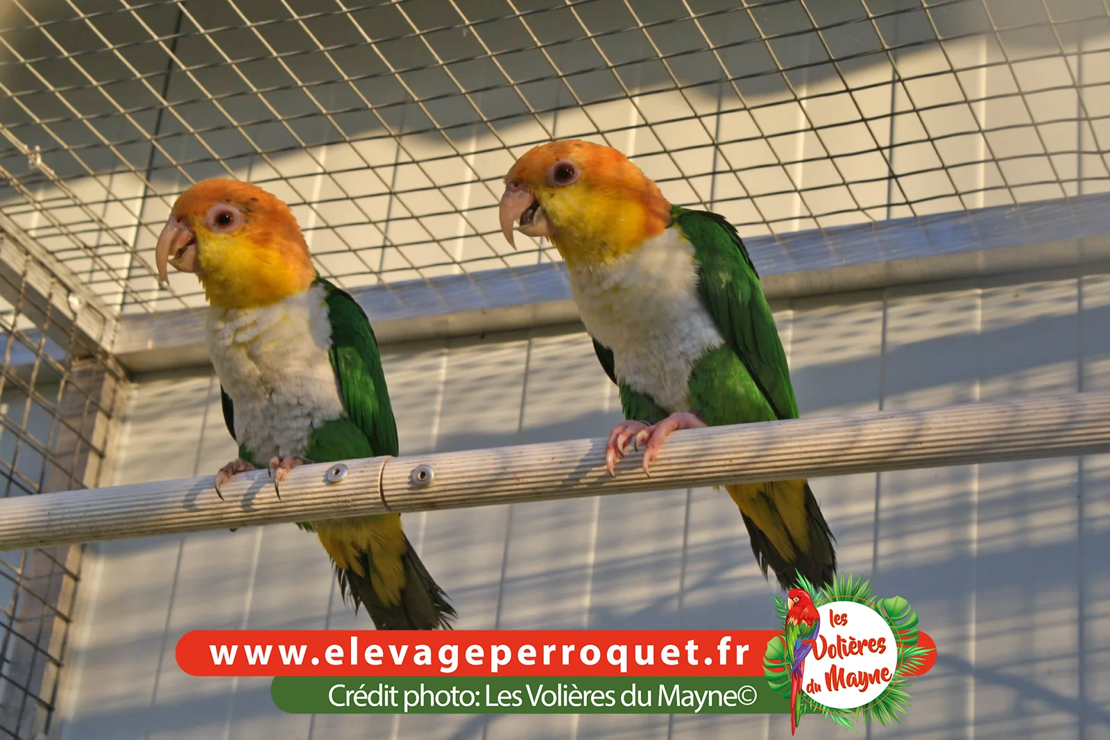 Les Caïques à cuisses jaunes (Pionites leucogaster xanthomeria)Les Caïques à cuisses vertes (Pionites leucogaster leucogaster)