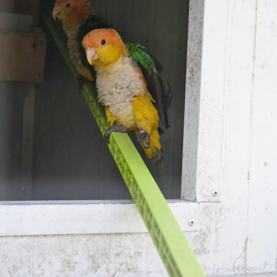 En règle général, les Caïques sont des vraies clowns avec leurs acrobaties et leur facultés de faire des petits bonds sur le sol, ou de jouer allongés sur le dos. Les Caïques sont câlins, d’autres un peu plus indépendants. Ils sont très curieux et très gourmands.